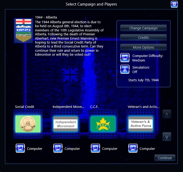 The 1944 Alberta general election is due to be held on August 8th, 1944, to elect members of the 10th Legislative Assembly of Alberta. Following the death of Premier Aberhart, new Premier Ernest Manning is hoping to lead the Social Credit Party of Alberta to a third consecutive term. Can they continue their rule and return to power in Edmonton or will they be voted out?
